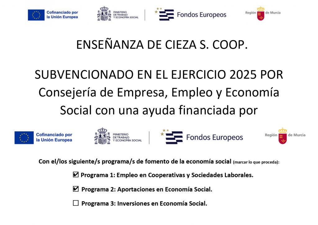 LA COOPERATIVA DE ENSEÑANZA DE CIEZA S.COOP. HA SIDO SUBVENCIONADA EN EL EJERCICIO 2025 POR LA CONSEJERÍA DE EMPRESA, EMPLEO Y ECONOMÍA SOCIAL, MEDIANTE SUBVENCIONES COFINANCIADAS POR LA UNIÓN EUROPEA, EL MINISTERIO DE TRABAJO Y ECONOMÍA SOCIAL Y LOS FONDOS EUROPEOS, EN EL MARCO DE LOS PROGRAMAS DE FOMENTO DE LA ECONOMÍA SOCIAL, QUE INCLUYEN ACTUACIONES DESTINADAS AL EMPLEO, APORTACIONES E INVERSIONES EN COOPERATIVAS, ORIENTADAS AL FORTALECIMIENTO Y DESARROLLO DE ETSE MODELO EMPRESARIAL.